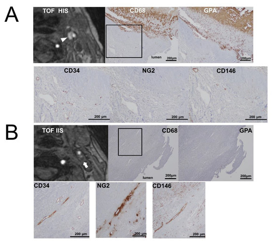 Representative cases of the TOF-HIS group (A) and the TOF-IIS group (B). Carotid plaques with high intensity (arrowhead) and iso intensity (arrow) signals on TOF-MRA. The photomicrographs of immunohistochemistry show many glycophorin A and CD68-positive cells in the TOF-HIS group. In both groups, CD34-positive neovessels are equally distributed. NG2 and CD146-positive neovessels are densely distributed in the TOF-IIS group. Square outlines indicate plaque shoulder lesions.