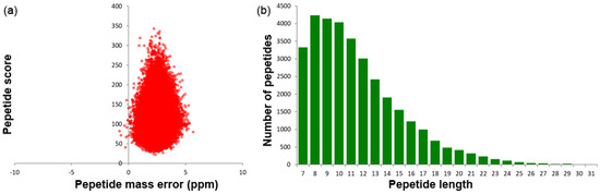 MS identified information based on proteomics analysis: (a) Average peptide mass error; (b) All identified peptides length distribution.