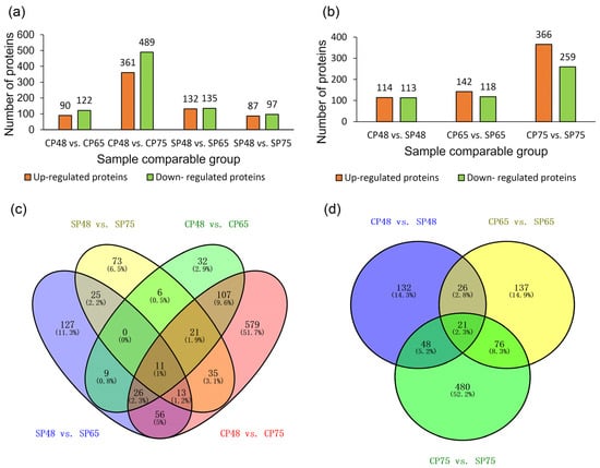 Differentially abundant proteins (DAPs) in all compared groups: (a) The information about DAPs was present in the compared groups of CP48 vs. CP65, CP48 vs. CP75, SP48 vs. SP65, and SP48 vs. CP75. (b) The information about DAPs was present in the compared groups of SP48 vs. CP48, SP65 vs. CP65, and SP75 vs. CP75. (c) DAPs were analyzed by the Venn diagram in the compared groups of CP48 vs. CP65, CP48 vs. CP75, SP48 vs. SP65, and SP48 vs. CP75. (d) DAPs were analyzed by the Venn diagram in the compared groups of SP48 vs. CP48, SP65 vs. CP65, and SP75 vs. CP75. CP48 represents 48 h after cross-pollination, CP65 represents 65 h after cross-pollination, CP75 represents 75 h after cross-pollination, SP48 represents 48 h after self-pollination, SP65 represents 65 h after self-pollination, and SP75 represents 75 h after self-pollination.