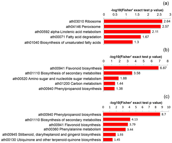 KEGG enrichment analysis also showed that the DAPs between CP48 and SP48 were mostly enriched in the pathway of ribosome (ath03010), peroxisome (ath04146), and alpha-linolenic acid metabolism (ath00592) (Figure 3a); DAPs between CP65 and SP65 were largely enriched in the pathway of flavonoid biosynthesis (ath00941), biosynthesis of secondary metabolites (ath01110), and amino sugar and nucleotide sugar metabolism (ath00520) (Figure 3b); DAPs between CP75 and SP75 were primarily enriched in the pathway of phenylpropanoid biosynthesis (ath00940), biosynthesis of secondary metabolites (ath01110), and flavonoid biosynthesis (ath00941) (Figure 3c).
