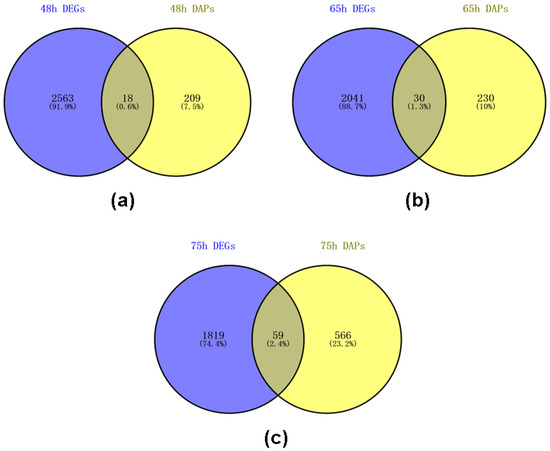 Venn analysis of differentially expressed genes (DEGs) and DAPs of pistils between self- and cross-pollinated in C. oleifera: (a) Venn analysis of DEGs and DAPs of pistils at 48 h after self- and cross-pollinated in C. oleifera; (b) Venn analysis of DEGs and DAPs of pistils at 65 h after self- and cross-pollinated in C. oleifera; (c) Venn analysis of DEGs and DAPs of pistils at 75 h after self- and cross-pollinated in C. oleifera.