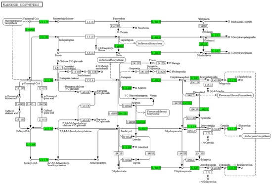 KEGG Pathway analysis of flavonoid biosynthesis 75 h after self- and cross-pollination in C. oleifera. The green color indicated decreased protein abundances level in self-pollinated pistils compared with cross-pollinated pistils.