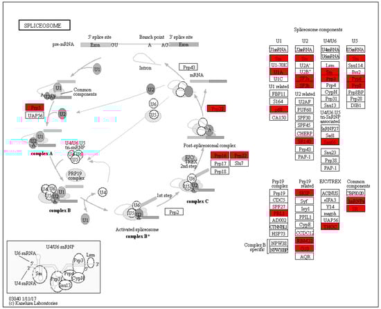 KEGG Pathway analysis of splicesome 75 h after self- and cross-pollination in C. oleifera. The red color indicated increased protein abundances level in self-pollinated pistils compared with cross-pollinated pistils.