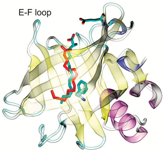 The most abundant protein in cow’s milk is β-lactoglobulin (BLG), which corresponds to 50% of whey and 12% of whole milk proteins [10]. It belongs to the lipocalin family of small extracellular proteins that carry hydrophobic ligands [11]. BLG is relevant to the food industry due to its binding spectrum and abundance in cow’s milk; thus, it has been extensively characterized, biochemically and structurally, through X-ray diffraction (XRD), NMR and computational approaches [12,13,14,15].