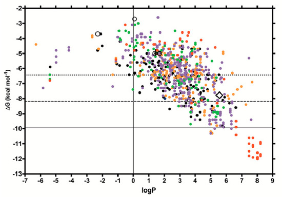 The results of the rigid docking of 889 pesticide molecules to BLG (1GXA). The calculated logP of each molecule is plotted versus the binding energy found through docking. A solid vertical line indicates the logP value where a compound is equally soluble in water and in octanol. The horizontal lines indicate the mean affinity (dotted line at −6.4 kcal/mol), and two standard deviations: −1σ (broken line at 8.1 kcal/mol) and −2σ (solid line at −9.94 kcal/mol). The pesticide class Ia is in red, class Ib in green, class II in purple, class III in orange and class U in black. The palmitate docking result is shown with a diamond, and the negative controls are in empty circles.