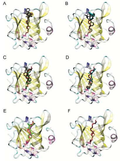 The position of representative pesticides in the BLG calyx, after docking. Eleven representative pesticides identified as “probable ligands” are shown, ordered by class, as in Table 1: (A) class Ia, bromadiolone (yellow) and chlorophacinone (gray); (B) class Ib, cypermethrin (black) and coumatetralyl (teal); (C) class II, permethrin (green) and rotenone (brown); (D) class III, biphenyl (orange), cyclohexylbenzene (purple) and resmethrin (teal); (E) class U, fenoxycarb (violet) and tetramethrin (lime green). (F) shows paraquat, a polar pesticide not selected as a “probable ligand” (pink). Palmitate’s crystallographic position in the calyx is shown for comparison (red in all panels). All ligands are represented by sticks.