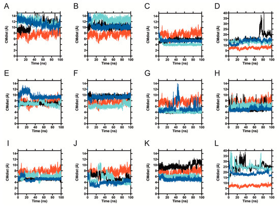 To track the movement of ligands relative to the binding site, we employed a simple metric: measuring the distance from the center of mass (CM) of each ligand to the CM of the ring in BLG′s residue F105, located at the middle of the calyx (shown in Figure 1). We will refer to this distance as the CM distance (CMdist). As a reference, the CMdist between the F105 ring and the sidechain of residue E62, located at the calyx entrance (also shown in Figure 1), was 19.66 ± 0.75 Å. To distinguish ligands moving along the length of the calyx from those leaving it altogether, we used the CMdist between F105 and E62 as a threshold. A ligand-F105 CMdist > 19.66 Å was considered to be outside of the binding site. In Figure 4, we show the CMdist over time for the simulations of 1GXA with the representative pesticides. Three trajectories were analyzed per pesticide and contrasted against palmitic acid (in red, as a reference in each panel of Figure 4). Ten out of the 11 pesticides tested remained below the 19.66 Å threshold in all trajectories, suggesting a stable binding inside the calyx. Only coumatetralyl and paraquat exceeded the CMdist threshold. Coumatetralyl docked at the calyx mouth (Figure 3B) and exceeded the threshold in one out of three trajectories (Figure 4D, black trace), suggesting a tendency to leave the calyx. Paraquat exhibited CMdists above the threshold in all trajectories (Figure 4L), suggesting unstable binding, which contrasted with the pesticides deemed as “probable ligands”—for example, pyrethroids (Figure 4C,E,I,J)—which maintained CMdists similar to or lower than that of palmitate.