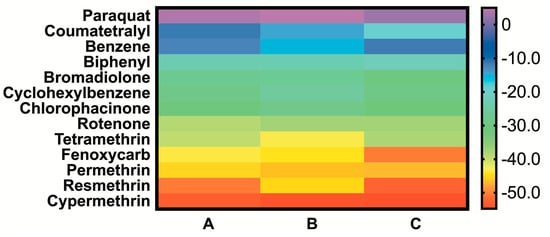 A heatmap of the absolute ΔG calculated from MMGBSA for the 12 simulated pesticides and the negative control, benzene, in triplicate (A, B and C). The highest affinities are shown at the bottom.