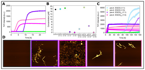Sternke-Hoffmann, R.; Peduzzo, A.; Bolakhrif, N.; Haas, R.; Buell, A.K. The Aggregation Conditions Define Whether EGCG is an Inhibitor or Enhancer of α-Synuclein Amyloid Fibril Formation. Int. J. Mol. Sci. 2020, 21, 1995. https://doi.org/10.3390/ijms21061995