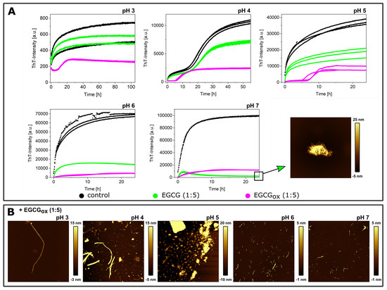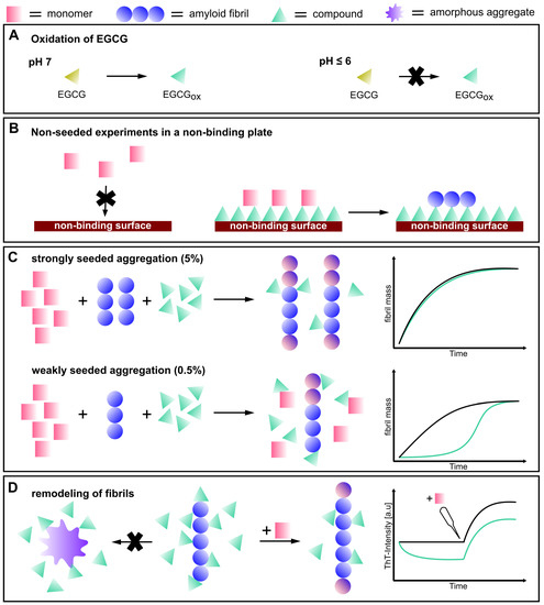- Sneideris, T.; Sakalauskas, A.; Sternke-Hoffmann, R.; Peduzzo, A.; Ziaunys, M.; Buell, A.K.; Smirnovas, V. The environment is a key factor in determining the anti-amyloid efficacy of egcg. Biomolecules 2019, 9, 855. [Google Scholar] [CrossRef]