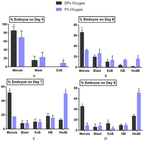 Effect of varying oxygen levels (20% vs. 5%) on developmental kinetics of buffalo embryos. All the experiments were replicated three times. The percentage of embryos at different developmental stages, morula, blastocyst (Blast), expanded blastocyst (ExB), hatching blastocyst (HB), hatched blastocyst (HedB), on day 5, 6, 7 and 8 was evaluated. There was a significantly higher rate of embryos at advanced developmental stages in 5% oxygen as compared to 20% oxygen. Fifty-nine and 53 embryos from 20% and 5% oxygen group, respectively, were evaluated on day 5 (A). Sixty-four embryos from each group were evaluated on day 6 (B). Sixty-three and 64 embryos from 20% and 5% oxygen group respectively, were evaluated on day 7 (C). Sixty-nine and 60 embryos from 20% and 5% oxygen group, respectively, were evaluated on day 8 (D). Values represent mean % ± S.E.M. Asterisk (*) indicates the statistical difference, p < 0.05.