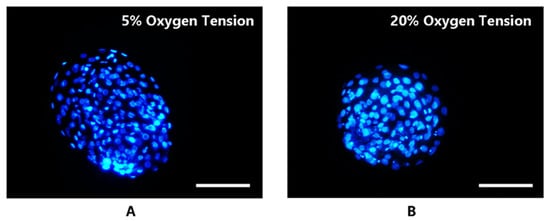 The cell count was determined by staining the hatched blastocysts with Hoechst 33342. These morphological findings of embryo development were further reinforced by the cell count evaluation, as shown in Figure 3, which revealed that embryos cultured under 5% O2 had significantly (p < 0.05) higher cell counts as compared to the embryos developed under 20% O2 (Table 1).