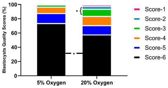 Embryo quality scoring. Physiological oxygen improved the quality of blastocysts, as indicated by lower percentage of low score blastocysts and higher proportionate of high score blastocysts. Asterisk (*) indicates the significant difference (p < 0.05) between the groups.