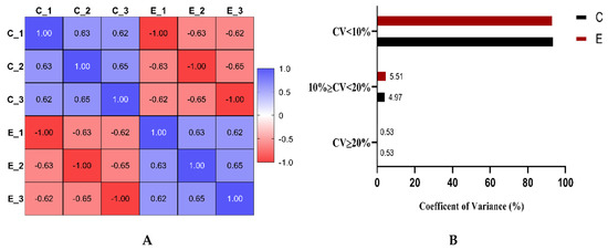 Precision of proteomic quantification. The stability of proteomics data was determined by estimating the Pearson’s correlation coefficient between the replicates of each group (C = 20% O2 and E = 5% O2). A significant correlation was found between the replicates of both groups (A). The reliability of the data was further supported by variance analysis, as more than 90% of the proteins from both groups had a coefficient of variance of less than 10% (B). For each replicate (n = 3), 6 hatched blastocysts from each group (n = 2) were included in proteomic analysis.