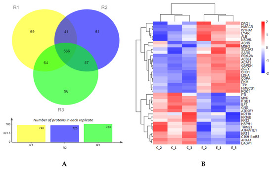Protein profile obtained by labelled iTRAQ LC-MS/MS Analysis. Venn diagram showing the overlap of the quantified proteins within the three replicates (R1, R2 and R3). About 72.28% (566) of all the proteins (954) were found in every replicate, showing the good conformance of the samples (A). Heatmap presenting the distribution of differentially expressed proteins (log2FC [] > 20%, p < 0.05). Pink and blue bars showing proteins that are significantly upregulated (25) and downregulated (18) in the 5% oxygen group in comparison with 20% oxygen group (B). The uncharacterized differentially expressed proteins have been omitted from the heatmap. C and E correspond to 20% and 5% oxygen, respectively.