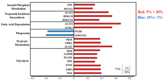 The identified differentially expressed proteins were analyzed based on the Kyoto Encyclopedia of Genes and Genomes (KEGG) database. Our results identify that upregulated proteins in 5% O2 embryos were mainly enriched in glycolysis, pyruvate metabolism, fatty acid degradation, terpenoid backbone synthesis and inositol phosphate metabolism (Figure 8). The downregulated proteins in 5% O2 embryos were mainly enriched in phagosome activity (Figure 8).