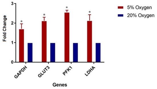 The proteomics data were validated by real time quantitative PCR. The four genes regulating aerobic glycolysis were selected for the validation of the results. The gene involved in glucose transport (GLUT3, also known as SLC3A2), a key regulator of glycolysis, phosphofruktokinsae-1 (PFK1), glycolysis intermediate, glyceraldehyde phosphate dehydrogenase (GAPDH) and the gene responsible for the conversion of pyruvate to lactate (LDHA) were selected for RT-qPCR. The qPCR analysis revealed significant differences in mRNA expression level between 5% oxygen and 20% Oxygen among all four up-regulated proteins and thus validated the findings of proteomic analysis (Figure 9).