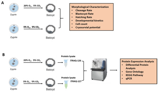 Schematic illustration of experimental design. Buffalo embryos were cultured in 5% or 20% oxygen and evaluated for morphological parameters of embryo development (A). Alterations in embryo proteome after culturing in different oxygen levels (5% vs 20%) were assessed by using labelling based iTRAQ quantitative proteomics approach (B).