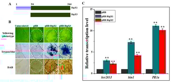 Defense reaction induced by transient expression of ripX1 and ripX3 in Nicotiana benthamiana. (A) Schematic diagram of expressed RipX1 and RipX3. (B) Yellowing phenotypes induced by RipX1 and RipX3. The infiltration areas were indicated by circles. All the experiments were repeated three times. (C) Activation of the defense genes hsr203J, hin1, and PR1a. The transcript level of each gene in plants transformed with empty vector pHB was set to 1, and levels in other plant samples were calculated relative to that. Data represent mean and standard deviation of three technical replicates. The asterisks denote statistical significance (** p < 0.01).