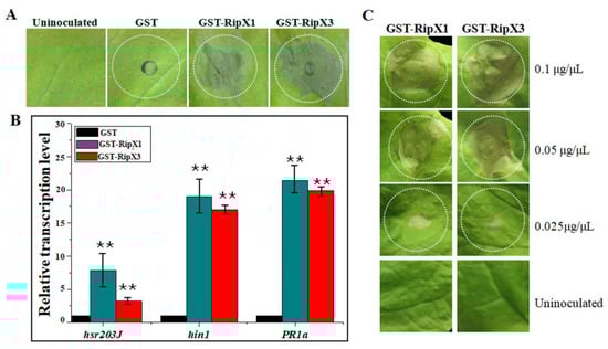The ripX1 and ripX3 genes were cloned into pET41a(+) for fusion with a GST tag (Table S2). After the constructs were separately transformed into BL21(DE3), GST fusion proteins were induced with 0.1 mM isopropyl-β-d-thiogalactopyranoside and purified from the supernatant, using glutathione resin []. The purity and concentration of protein samples were analyzed by 10% SDS-PAGE and the Bradford method. Then, 0.2 μg/μL GST-RipX1 and GST-RipX3 proteins were infiltrated into N. benthamiana leaves, to detect HR induction. The GST tag was used as a negative control. To determine the minimum concentration essential for HR induction, the proteins were infiltrated into N. benthamiana leaves at 0.1, 0.05, and 0.025 μg/μL. At 24 h post-infiltration, detection of HR induction, histochemical staining, and qRT-PCR were conducted. Each performance was repeated three times.
