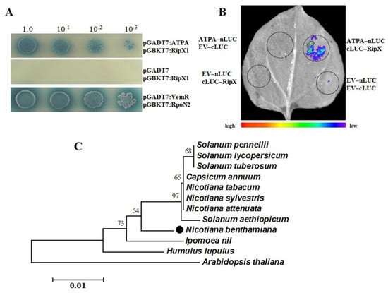 The construct pGBKT7:RipX1 and cDNA library of N. benthamiana were co-transformed into the yeast host strain AH109, by LiAc-mediated transformation. The pGADT7 plasmids were extracted from the screened positive colonies, to repeat the Y2H assay. The plasmid that exhibited a positive interaction with RipX1 was identified as ATPA based on DNA sequencing. The coding region of the atpA gene was amplified and cloned into pGADT7 to generate pGADT7:ATPA. After that, pGADT7:ATPA and pGBKT7:RipX1 were then co-transformed into AH109. The transformant was examined for growth on SD/-Ade/-Leu/-Trp/-His/ supplemented with 20 μg/mL X-α-galactosidase []. The Y2H repeat experiment was performed three times.