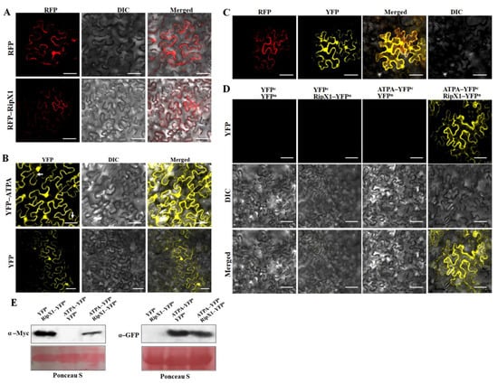 RipX1 was fused to the C-terminus of red fluorescent protein (RFP) in the pGDR vector, and ATPA was fused to the C-terminus of yellow fluorescent protein (YFP) in the pGDY vector. RFP-RipX1 was localized to the cell membrane and cytoplasm, while YFP-ATPA was localized to the cell membrane, cytoplasm, and nucleus, as well as a few mitochondrial organelles (Figure 4A,B). RFP-RipX1 and YFP-ATPA were colocalized at the cell membrane and cytoplasm (Figure 4C). In an effort to detect the interaction in vivo, a bimolecular fluorescence complementation (BiFC) assay was employed to confirm that RipX1 and ATPA interacted at the cell membrane and cytoplasm (Figure 4D). In this case, the expressions of ATPA-YC and RipX1-YN were analyzed by Western blot detection (Figure 4E). To ensure the localization of ATPA to mitochondria, the mitochondrial marker MT-rk-CD3-991 was used. Upon transformation of the MT-rk-CD3-991 construct alone, a red fluorescence signal (RFP) was observed at the cell membrane, in the nucleus, and in a large number of mitochondria (Figure S1A). When MT-rk-CD3-991 was co-transformed with GFP-ATPA, yellow fluorescence was observed in a few mitochondria, in addition to the cell membrane and nucleus (Figure S1B). This finding indicated that ATPA did localize to mitochondria, although a large amount of ATPA was actually located in the cell membrane and nucleus.