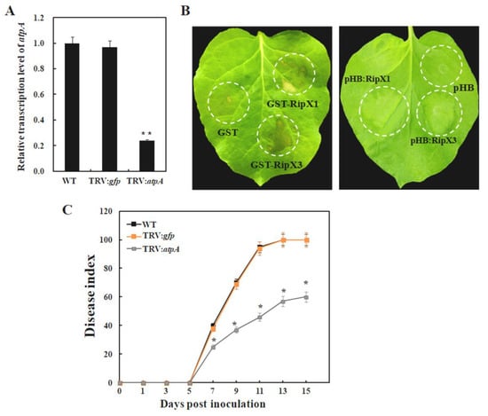 The soil inoculation method was used to assess the disease development in atpA-silenced N. benthamiana plants []. The cultured cells of R. solanacearum were prepared to a final concentration of 1 × 108 CFU/mL. The roots of wild-type, atpA-silenced or gfp-silenced control plants were first wounded and then were inoculated with R. solanacearum cell suspension, at 10 mL per pot. Disease severity and the percent severity index were recorded, using a previously described method []. This experiment was repeated four times. For every repeat, 6 wild-type, atpA-silenced, or gfp-silenced plants were assayed for disease development.