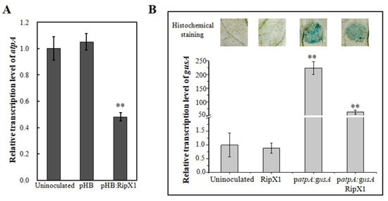 RipX1 suppressed atpA transcription. (A) Reduction in atpA transcription in N. benthamiana transiently expressing RipX1. The plants transformed with the pHB empty vector were used as controls. (B) Examination of atpA promoter activity. For qRT-PCR analyses, the transcript level in uninoculated plants was set to 1, and the level in other samples was calculated relative to that. Error bars indicate standard deviations of three individual replicates, and asterisks denote statistical significance (** p < 0.01).