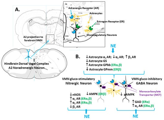 Model for Estrogen Receptor (ER) Modulation of Hindbrain A2 Noradrenergic Control of Ventromedial Hypothalamic Nucleus (VMN) Glucoregulatory Transmission. The enlarged rectangle in Panel A depicts ER and adrenergic receptor (AR) expression by VMN glucoregulatory neurons and astrocytes. Panel B illustrates ER-alpha (ERα) and/or ER-beta (ERβ)-dependent NE control of VMN astrocyte glycogen metabolic enzyme protein (glycogen phosphorylase-brain (GPbb) and -muscle (GPmm) type) expression. The same panel shows differential ER modulation of noradrenergic influence on gluco-stimulatory nitrergic (α1AR; α2AR; AMPK) versus gluco-inhibitory GABAergic (glutamate decarboxylase (GAD); α2AR) protein profiles. NE control of glucoregulatory signaling likely involves direct action on nitrergic and GABA neurons as well as regulation of astrocyte provision of glycogen-derived substrate fuel, e.g., lactate, by monocarboxylate transporter (MCT) function.