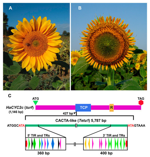 - Fambrini, M.; Basile, A.; Salvini, M.; Pugliesi, C. Excisions of a defective transposable CACTA element (Tetu1) generate new alleles of a CYCLOIDEA-like gene of Helianthus annuus. Gene 2014, 549, 198–207. [Google Scholar] [CrossRef]