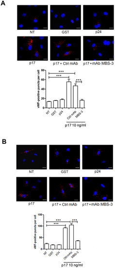 vWF accumulation in WPBs is specifically induced by p17. mCherry-vWF nucleofected HUVECs (A) and HMVEC-Ls (B) were serum starved for 16 h and then treated with 10 ng/mL of GST, p24 or p17 in complete medium. When indicated, cells were stimulated with p17 (10 ng/mL) after preincubation of the viral protein with 1 µg/mL of mAb to p17 (MBS-3) or unrelated control mAb (Ctrl mAb) for 30 min at 37 °C. The images display vWF signals in red and cell nuclei in blue. Scale bar, 10 μm. Red-positive punctate structures were counted in order to quantify the levels of WPBs. NT indicates not treated cells. Values reported for vWF positive structures are the mean ± SD of 3 independent experiments with similar results. Statistical analysis was performed by one-way ANOVA, and the Bonferroni post-test was used to compare data (*** p < 0.001).