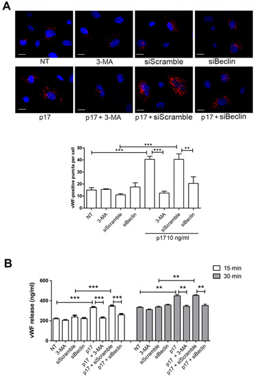 Inhibition of autophagy decreases p17-mediated release of vWF. (A) HUVECs were nucleofected with a mCherry-vWF-expressing plasmid and, when indicated, in combination with siBeclin-1 or siScramble. Twenty-four h after nucleofection, cells were serum starved for 16 h and then stimulated or not with 10 ng/mL of p17 in complete medium. When indicated, HUVECs were serum starved for 16 h in the presence or absence of 3-MA (5 mM). The images display vWF signals in red and cell nuclei in blue. Scale bar, 10 μm. Red-positive punctate structures were counted in order to quantify the levels of WPBs. NT indicates not treated cells. Values reported for vWF positive structures are the mean ± SD of 3 independent experiments with similar results. Statistical analysis was performed by one-way ANOVA, and the Bonferroni post-test was used to compare data (** p < 0.01, *** p < 0.001). (B) HUVECs were serum starved for 16 h in the presence or absence of 3-MA (5 mM). When indicated, cells were nucleofected with siBeclin-1 or siScramble and serum starved 24 h after nucleofection. After serum starvation, cells were cultured in complete medium containing or not 10 ng/mL of p17. Supernatants were collected at 15 and 30 min of culture and analyzed for the presence of vWF by a standard quantitative ELISA. Bars represent the mean ± SD of triplicate samples. Statistical analysis was performed by one-way ANOVA, and Bonferroni post-test was used to compare data (** p < 0.01, *** p < 0.001). NT indicates not treated cells.