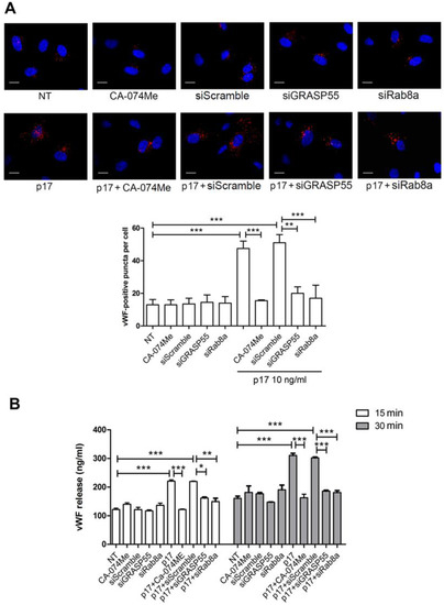 Mechanistic insights into the vWF secretory activity of p17. (A) HUVECs were nucleofected with a mCherry-vWF-expressing plasmid in combination or not with siGRASP55, siRab8a or siScramble. Twenty-four h after nucleofection, cells were serum starved for 16 h and then treated with 10 ng/mL of p17. When reported, HUVECs were serum starved in the presence or absence of 50 µM of CA-074Me (cathepsin-β inhibitor) and then stimulated or not with 10 ng/mL of p17. The images display vWF signals in red and cell nuclei in blue. Scale bar, 10 μm. Red-positive punctate structures were counted in order to quantify the levels of WPBs. NT indicates not treated cells. Values reported for vWF positive structures are the mean ± SD of 3 independent experiments with similar results. Statistical analysis was performed by one-way ANOVA, and the Bonferroni post-test was used to compare data (** p < 0.01, *** p < 0.001). (B) HUVECs were serum starved in the presence or absence of 50 μM of CA-074Me. In some experiments, HUVECs were nucleofected with siScramble, siGRASP55 or siRab8a and 24 h after nucleofection, cells were serum starved for 16 h. After serum starvation, HUVECs were cultured in complete medium containing or not 10 ng/mL of p17. After 15 and 30 min of culture, supernatants were collected and analyzed by a standard quantitative ELISA. Bars represent the mean ± SD of triplicate samples. Statistical analysis was performed by one-way ANOVA, and the Bonferroni post-test was used to compare data (* p < 0.05, ** p < 0.01, *** p < 0.001). NT indicates not treated cells.