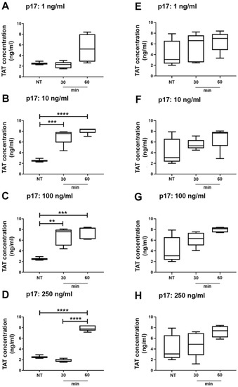 Experiments on mice have been ethically approved by the government of Lower Saxony State of Germany with the No. 33.19-42502-04-16/2109. C57BL/6 and BECN-1 mice (carrying a monoallelic deletion of the autophagy-related Beclin-1 gene) (Jackson Laboratory, Bar Harbor, ME, USA), 8–10 weeks old female mice were i.v. injected or not with 1, 10, 100 or 250 ng/mL of p17/mouse (n = 5/groups). Citrated plasma samples were collected at 30 and 60 min following p17 injection and analyzed for the presence of TAT complexes by ELISA (Assaypro LLC., St. Charles, MO, USA). Results were expressed as concentration of TAT compared to values of not treated (NT) animals.