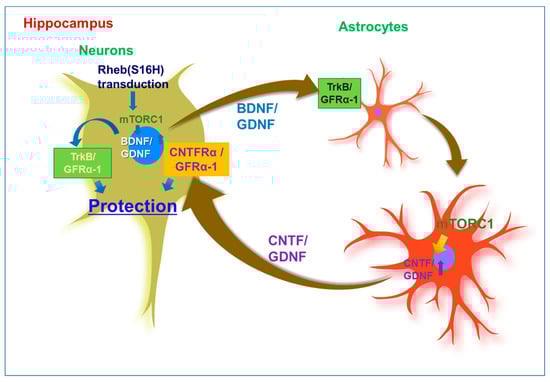 - Jeon, M.T.; Moon, G.J.; Kim, S.; Choi, M.; Oh, Y.S.; Kim, D.W.; Kim, H.J.; Lee, K.J.; Choe, Y.; Ha, C.M.; et al. Neurotrophic interactions between neurons and astrocytes following AAV1-Rheb(S16H) transduction in the hippocampus in vivo. Br. J. Pharmacol. 2020, 177, 668–686. [Google Scholar] [CrossRef]