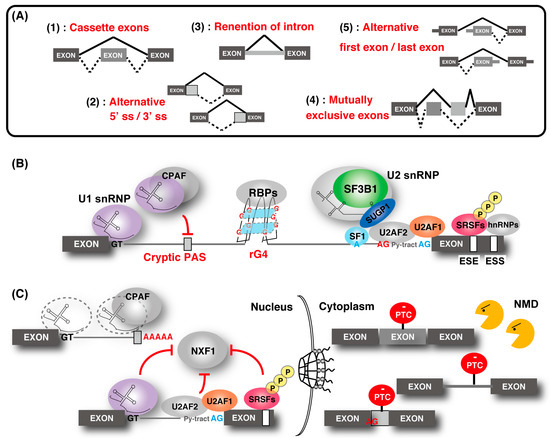 Regulation of gene expression through alternative splicing. (A) Five types of alternative splicing events. "Cassette exons" means inclusion or skipping of an exon. (B) Outline of the alternative splicing control by various factors. The U1 ribonucleoprotein (snRNP) function to recognize the 5′ splice site (ss) and the cryptic polyadenylation signals (PASs) with cleavage and polyadenylation factors (CPAFs). Splicing factor 1 (SF1), U2 snRNP auxiliary factor 1 (U2AF1), and U2AF2 bind the branch point (BP; shown as a blue “A”), polypyrimidine tract (shown as “Py-tract”), and 3′ ss (shown as a blue “AG”), respectively. U2 snRNP containing splicing factor 3B1 (SF3B1), SURP and G-patch domain containing 1 (SUGP1) displaces SF1 and binds to the BP. SR protein families and hnRNPs recognize the exonic-splicing enhancer (ESE) and exonic-splicing silencer(ESS) elements, respectively, and contribute to the recognition of the splice site and the spliceosome assembly by splicing factors. The cryptic 3′ ss (shown as a red “AG”) recognition is repressed by hnRNP. RNA G-quadruplex (rG4) structures affect splicing by acting as RNA-binding protein motifs. (C) Association of alternative splicing and gene regulation. Without U1 snRNP, the CPAF recognizes intronic PASs and generates short transcripts due to premature cleavage and polyadenylation. Some intron-containing transcripts are associated with U1 snRNP, U2AF2, and SR proteins, and they are tethered in the nucleus. Intron-containing transcripts, which are exported to the cytoplasm, often contain a premature termination codon (PTC) and are eliminated by nonsense-mediated messenger RNA (mRNA) decay (NMD). Similarly, other alternative and cryptic-spliced transcripts with PTC are also degraded by NMD.