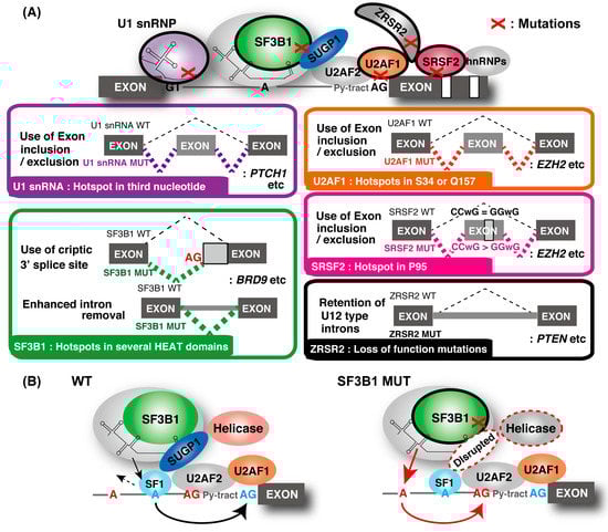 Frequent and recurrent mutations are found within the early components of the RNA splicing machinery. For example, mutations in SF3B1, U2AF1, SRSF2, and zinc finger CCCH-type, RNA-binding motif and serine/arginine-rich 2 (ZRSR2) were found in a variety of hematological malignancies, including myelodysplastic syndromes (MDSs) and chronic lymphocytic leukemia (CLL), and they are mutually exclusive [94]. Heterozygous hotspot missense mutation was common characteristic for SF3B1, SRSF2, and U2AF1 (Figure 2A). Mutations in ZRSR2 throughout the coding sequence caused loss-of-function mutations [95]. Similar mutations were reported with a lower frequency in solid tumors [96]. Recently, recurrent hotspot mutations at the third nucleotide of U1 snRNA were found in several cancer types, including in medulloblastoma, with high frequency [97]. Further investigation revealed that hotspot U1 mutations were present in about 50% of sonic hedgehog (SHH) medulloblastomas, which represents one group of medulloblastomas [98]. In addition, mutations were not present across other subgroups of medulloblastoma, indicating that U1 snRNA mutations are highly recurrent in and extremely specific to SHH medulloblastoma. It was reported that 119 splicing factor genes carry putative driver mutations in one or more cancer types from tumor cohort studies [99]. These reports suggested that spliceosomal mutations were considered a new hallmark and driver of tumorigenesis rather than merely passenger mutations [1]. Mutations of various mRNA splicing factors were globally analyzed and shown to affect gene expression. In addition, cancer-specific splicing changes are increasingly recognized as contributing to tumorigenesis via various mechanisms.