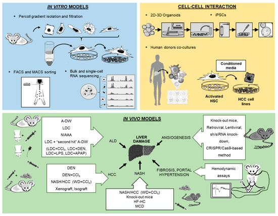 Cell culture techniques are important tools for the study of pathogenesis and treatment of liver diseases. Each different cell type plays a specific role in the liver. The parenchymal cells, mainly hepatocytes, constitute 80% of the total liver volume and are responsible for the majority of liver functions. The nonparenchymal cells include hepatic stellate cells (HSCs), liver sinusoidal endothelial cells and resident macrophages such as Kupffer cells (KCs) [1]. The connective tissue of the liver consists of blood vessels, nerves, lymphatic vessels, bile canaliculi and extracellular matrix [2]. Inside the bile canaliculi, the epithelial cells, the so-called cholangiocytes, participate in the regulation of bile production and in the process of biliary repair [3]. In recent years, biliary research and cholangiocytes gained much interest in the research of liver diseases. Although conventional procedures to isolate liver cells, such as in situ liver perfusion and collagenase digestion followed by density gradient isolation, are well established, novel methods have been introduced such as fluorescence-activated cell sorting (FACS) of HSCs using vitamin A autofluorescence. These approaches provide high purity of HSCs and are reproducible. In the coming years, the use of 2D microscopy, 3D microscopy, intravital microscopy, flow cytometry and cell isolation for subsequent functional experiments or expression analyses is expected to significantly increase characterization of hepatic cell populations and their interactions with circulating immune cells. For instance, these methods have been used to study the impact of hepatic macrophages and monocytes on steatosis, inflammation, hepatocellular injury, HSCs activation and angiogenesis [4]. Two novel technologies from stem cell research, induced pluripotent stem cells (iPSCs) and liver organoids, helped to decipher the pathophysiology of cholangiopathies [5]. Using in vitro models of primary human liver cells from different human donors, co-culture systems can simulate additional pathophysiological liver cell interactions, being complementary to animal models in preclinical analysis. Furthermore, development of animal models to experimentally mimic alcoholic liver disease (ALD), such as the liquid Lieber–DeCarli (LDC) diet, intragastric ethanol infusion and administration of carbon tetrachloride (CCl4) combined with ethanol in drinking water, can help to understand critical pathophysiological steps of human ALD, such as inflammation and fibrosis during ALD progression [6,7]. Moreover, HCC models are receiving increased attention, not only for the fast xenograft model, but also for application of N-nitrosodiethylamine (DEN) followed by repeated administration of CCl4 (Table 1) [8], as well as the model of non-alcoholic steatohepatitis (NASH) combined with a HCC model described recently by using a Western diet (WD) combined with CCl4 (Table 1) [7,9]. Finally, the assessment of systemic, splanchnic and portal hemodynamics in animal models is now well accepted and crucial for the evaluation of drugs for end-stage liver disease. The purpose of this review is to present technological tools that will enhance our ability to isolate and purify the different cell populations and other strategies to study the full spectrum of liver disease (Figure 1).