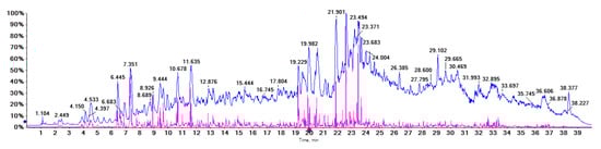 An ACQUITY UPLC detecting system (Waters Co., Milford, MA, USA) coupled to a triple time-of-flight (TOF) 5600+ mass spectrometer were employed for UPLC-Triple-TOF/MS analysis. An electrospray ionization source (AB SCIEX Co., Foster, CA, USA) and a ZORBAX-SB C18 analytical column (100 mm × 4.6 mm, Agilent Technologies Inc., Santa Clara, CA, USA) were used. Gradient elution conditions were the same as described above. MS conditions were listed as follows: negative ion scanning mode, MS scanning range of 100–1500 m/z; gas1 (GS1): 50 psi; gas2 (GS2): 50 psi; curtain gas (CUR): 35 psi; temperature of the ion source (TEM): 550 °C; voltage of the ion source(IS): −4500 V (negative); first order scanning: declustering potential (DP): 100 V; focusing voltage (CE): 10 V; second order scanning: TOF MS~Product Ion~IDA mode for data collection. CID energy: −20, −40 and −60 V. Before sample injection, CDS pump were used for mass axis correction to lower the error below 2 ppm.