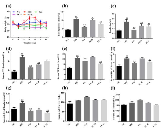 Effects of proanthocyanidins on serum biomarkers in HFD/STZ-induced type 2 diabetic mice. (a) Body weight. (b) Glucose level. (c) Insulin content. (d) TG. (e) TC. (f) HDL-C. (g) LDL-C. (h) ALT. (i) AST. NG, normal diet group; MG, HFD/STZ-induced T2DM; Fen, HFD/STZ-induced T2DM + 250 mg/kg fenofibrate; PC-H, HFD/STZ-induced T2DM + 200 mg/kg proanthocyanidins; PC-L, HFD/STZ-induced T2DM + 50 mg/kg proanthocyani-dins. Values are expressed as Mean ± SD, with 9 mice in each group. # p < 0.05 and ## p < 0.01 compared with the NG group; * p < 0.05 and ** p < 0.01 compared with the MG group.
