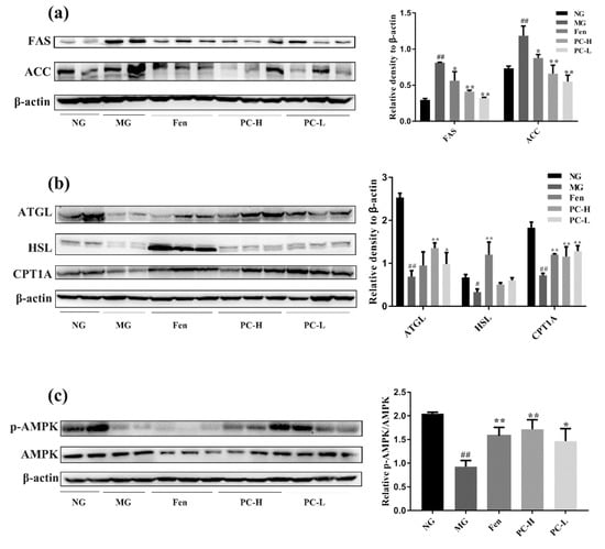 To further identify the mechanism of proanthocyanidins attenuating hyperlipidemia in diabetic mice, the lipid metabolism-related proteins were analyzed with western blot. Hepatic lipogenic and lipolytic proteins including FAS, ACC, ATGL, HSL, and CPT1A were detected. Phosphorylation of AMPK was also detected, considering its role as a sensor of energy metabolism [28]. ACC is a key regulator in lipid synthesis, which converts acetyl-CoA to malonyl-CoA. FAS modulate lipid homeostasis, increased expression of which leads to hepatic TG accumulation [29]. The activation of ACC and FAS inhibits CPT1A, which enhances fatty acid β-oxidation in mitochondria. As shown in Figure 4a–c, levels of FAS and ACC in diabetic mice were significantly increased compared to that of NG group. Compared with MG group, FAS and ACC expression in PC-H and PC-L groups were dramatically reduced. It is well known that ATGL is a triglyceride lipase that primarily catalyzes the first step of triglyceride hydrolysis. HSL is a rate-limiting lipolytic enzyme that exhibits higher substrate affinity for diacylglycerol. CPT1A enhances the transportation of fatty acid into mitochondrial and is involved in fatty acid β-oxidation. Western blot results showed reduced expression of ATGL and HSL in MG group, compared to NG group. Expression of CPT1A in MG group showed a trend of reduction, compared to NG group, although no statistical significance was obtained. These data indicated that fat hydrolysis and mitochondrial function in diabetic mice is severely impaired. After proanthocyanidins treatment, expression of lipolysis-related proteins were up-regulated. Taken together, these results indicate that proanthocyanidins might ameliorate HFD/STZ-induced hypertriglyceridemia via inhibiting lipogenesis and promoting lipid hydrolysis and fatty acid β-oxidation. Furthermore, as shown in Figure 4c, p-AMPK/AMPK ratio in liver tissue decreased in MG mice, compared to NG mice. 6-week treatment with proanthocyanidins up-regulated phosphorylation of AMPK in diabetic mice. PC-H-induced up-regulation is of statistical significance. These results suggest that proanthocyanidins may ameliorate deficits of hepatic lipid metabolism in HFD/STZ-induced diabetic mice through activating the AMPK/ACC/CPT1A signaling pathway.