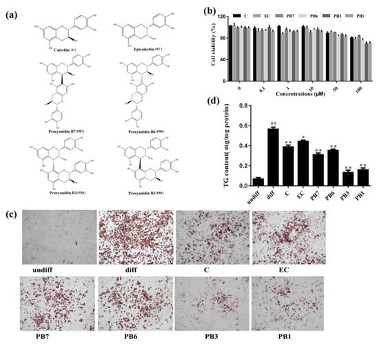 We investigated the anti-adipogenic effects of the six flavan-3-ols (Figure 5a) in cultured 3T3-L1 adipocytes. First, we examined the effects of six flavan-3-ols on cell viability in 3T3-L1 preadipocytes via MTT assay. As shown in Figure 5b, cell viability of 3T3-L1 preadipocytes was not altered after incubation with flavan-3-ols for 48 h at concentrations of 0.1, 1 and 10 µM. Decrease in cell viability was observed when concentration increased to 50 µM. Lipid accumulation was determined by oil-red-O staining at the end of differentiation on Day 8. Among all treatment, the PB3 and PB1 groups showed lowest accumulation of lipid droplets (Figure 5c). Cellular TG content were determined by TG kit and reduction in TG content were induced after flavan-3-ols treatment, with PB3 and PB1 showing most potent effect (Figure 5d).