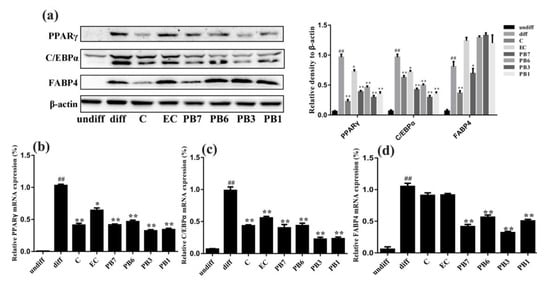 Effects of flavan-3-ols on adipogenesis. (a) Western blot analysis of the effects of the six flavan-3-ols on protein levels of PPARγ, C/EBPα and FABP4. RT-PCR analysis of the effects of the six flavan-3-ols on the mRNA levels of (b) PPARγ, (c) C/EBPα, and (d) FABP4. During differentiation, 90% of confluent 3T3-L1 preadipocytes were cultured and induced in the DMEM medium containing the differentiation cocktail with or without flavan-3-ols for 8 days. undiff, undifferentiated adipocytes; diff, differentiated adipocytes; C, catechin; EC, epicatechin; PB7, procyanidin B7; PB6, procyanidin B6; PB3, procyanidin B3; PB1, procyanidin B1. Values are shown as Mean ± SD of three independent triplicate experiments (n = 3). # p < 0.05 and ## p < 0.01 compared with undifferentiated adipocytes; * p < 0.05 and ** p < 0.01 compared with the differentiated adipocytes.