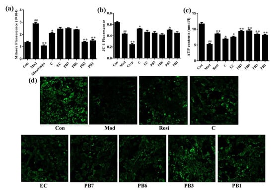 Effects of flavan-3-ols on mitochondrial function in insulin-resistant 3T3-L1 adipocytes. (a) Mitochondrial superoxide production. (b) Mitochondrial membrane potential. (c) The intracellular contents of ATP. (d) Mitochondrial mass. Fully differentiated 3T3-L1 adipocytes were treated with Dex for 48 h in the presence or absence of flavan-3-ols or rosiglitazone (100× g magnification). Con, normal differentiated 3T3-L1 adipocytes; Mod, Dex alone treated differentiated 3T3-L1 adipocytes; Rosi, rosiglitazone; C, catechin; EC, epicatechin; PB7, procyanidin B7; PB6, procyanidin B6; PB3, procyanidin B3; PB1, procyanidin B1. Values are shown as Mean ± SD of three independent triplicate experiments (n = 3). # p < 0.05 and ## p < 0.01 compared with normal differentiated adipocytes; * p < 0.05 and ** p < 0.01 compared with Dex only treated adipocytes.