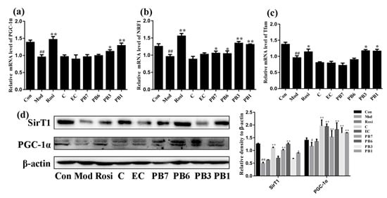 PGC-1α is critical in regulating mitochondrial biogenesis. NRF1 is a nuclear gene-encoded transcription factor that target to mitochondria and induces expression of Tfam [33]. Tfam can promote replication of mitochondrial DNA and transcription of mitochondrial genes. We investigated the effects of flavan-3-ols on expression of PGC-1α, NRF1, and Tfam in insulin-resistant 3T3-L1 adipocytes. As shown in Figure 9, Dex treatment caused significant reduction in the mRNA levels of PGC-1α, NRF1, and Tfam, while treatment with Rosi or compounds PB3 and PB1 increased their expression. On the other hand, treatment with flavan-3-ols in insulin-resistant 3T3-L1 adipocytes also increased the protein levels of PGC-1α and SirT1, which deacetylates and activates PGC-1α [34] (Figure 9d). In particular, compound PB1 displayed the strongest effect in elevating protein levels of SirT1 and PGC-1α (Figure 9d).