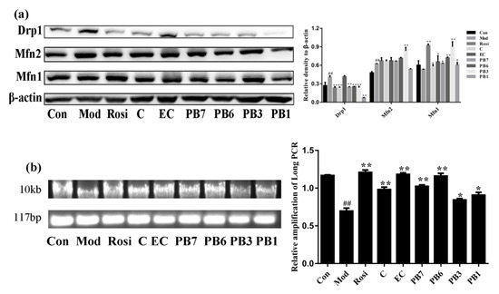 Mitochondria undergo continuous fusion and fission, balance of which is critical for maintaining their morphological and functional normality [35]. To determine the effects of flavan-3-ols on mitochondrial dynamics, western blot analysis was performed to determine the levels of mitochondrial fission proteins (Drp1) and mitochondrial fusion proteins (Mfn2 and Mfn1). Results showed that Dex treatment selectively increased the protein levels of Mfn2 and Drp1, while Mfn1 was not altered (Figure 10a). Treatment with flavan-3-ols showed different effects on the expression of Drp1, Mfn2, and Mfn1. Compound PB1 significantly decreased the levels of Drp1 and increased that of Mfn2, while compound PB3 significantly increased the expression of both Mfn2 and Mfn1. Damage of mitochondrial DNA (mtDNA) was detected by long PCR. As shown in Figure 10b, Dex caused significant mtDNA damage in 3T3-L1 adipocytes, while treatment with compound EC, PB6, or Rosi attenuated the damage.