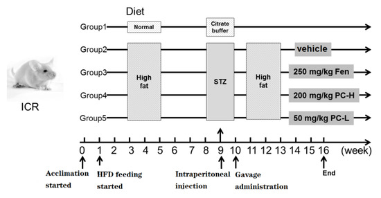 Six-week-old ICR male mice (20 ± 2 g) were obtained from Jinan Pengyue experimental animal breeding Co. Ltd. (Jinan, China). Animals were housed in environment of temperature 25 ± 2 °C, humidity 55 ± 5% and 12 h light/dark cycle, with free access to tap-water and standard food. All experimental procedures involving the usage of animals were approved by the Institutional Animal Care and Use Committee of the Chinese Academy of Science, Northwest Institute of Plateau Biology. Prior to experiment, ICR mice could acclimate to the environment for one week. The T2DM mouse model was induced as previously reported [63]. Design of animal experiment and treatment is summarized in Figure 11. After acclimation, some mice were fed with normal chow (3.2 kcal/g body weight, 4.65% calories derived from fat) and received intraperitoneal injection of citrate buffer (referred to as normal group, NG). The other mice were fed with HFD, 5 kcal/g body weight, 60% calories derived from fat) and received intraperitoneal injection of STZ (dissolved in citrate buffer, pH 4.4–4.5, 50 mg/kg, once per day for 3 consecutive days) to induce diabetes at week 9. At week 10, serum glucose levels were measured and those with value higher than 11.0 mM were used as diabetes mice for following studies. Diabetes mice were divided into four groups, the model group (vehicle treated, also referred to as group 2), Fen group (treated with 250 mg/kg fenofibrate, group 3), PC-H group (treated with 200 mg/kg proanthocyanidins, group 4) and PC-L (treated with 50 mg/kg proanthocyanidins, group 5). During treatment, mice were fed with HFD. The rodent food was purchased from Trophic Animal Feed High-Tech Co. Ltd. (Nantong, China). Drug administration was conducted via oral gavage between 8:30 and 9:30 o’clock in the morning from week 10 to 16, and the dosages were daily adjusted according to the body weight. At week 16, blood samples were obtained via retro-orbital sinus, and serum was collected after centrifugation (5000 g) for 15 min at room temperature. Mice were then sacrificed, and liver tissue was carefully dissected, washed with ice-cold saline, frozen with liquid nitrogen and kept at −80 °C.