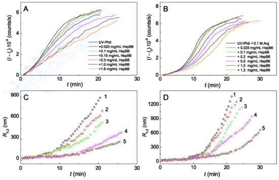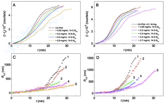 Figure 3 shows the dependences of (I − I0) and Rh,2 on time for aggregation of UV-Phb (0.25 mg/mL) in the presence of different concentrations of 14-3-3ζm (Figure 3A,C) and 14-3-3ζm + 0.1 M Arg (Figure 3B,D).