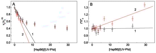 Using Equation (2) the initial stoichiometry of the HspB6–UV-Phb complexes (S0) in the absence (curve 1) and in the presence of 0.1 M Arg (curve 2) was determined: S0 = 11.5 ± 0.8 (R2 = 0.910) and S0 = 8.2 ± 0.6 (R2 = 0.894), respectively. The received data mean that in the presence of Arg fewer HspB6 molecules are needed to completely suppress aggregation of UV-Phb.