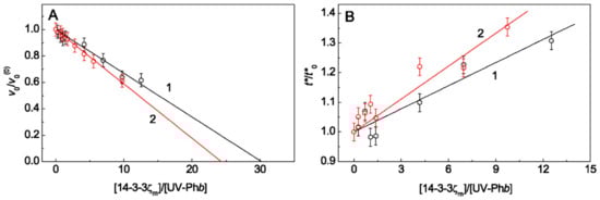 Determination of the initial stoichiometry of the 14-3-3ζm–UV-Phb complex (S0) showed that in the absence of Arg the S0 value was equal to 30.2 ± 1.3 (R2 = 0.969; Figure 4A, curve 1) and in the presence of 0.1 M Arg S0 = 24.3 ± 0.4 (R2 = 0.995; Figure 4A, curve 2). It was taken into account that the molecular weight of 14-3-3ζm is equal to 28 kDa. As can be seen from Figure 4B, the relative duration of the nucleation stage, t*/t*0, increases with increasing [14-3-3ζm]/[UV-Phb] ratio both in the case of the absence and in the presence of Arg (curves 1 and 2, respectively).